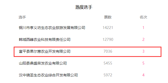 核心提示:熱烈慶祝富平縣果爾惠農(nóng)業(yè)開發(fā)有限公司在百姓放心陜西優(yōu)秀農(nóng)業(yè)企業(yè)(第四期)的網(wǎng)絡(luò)評(píng)選中以7036票榮獲第三名。獲得《AAA級(jí)放心